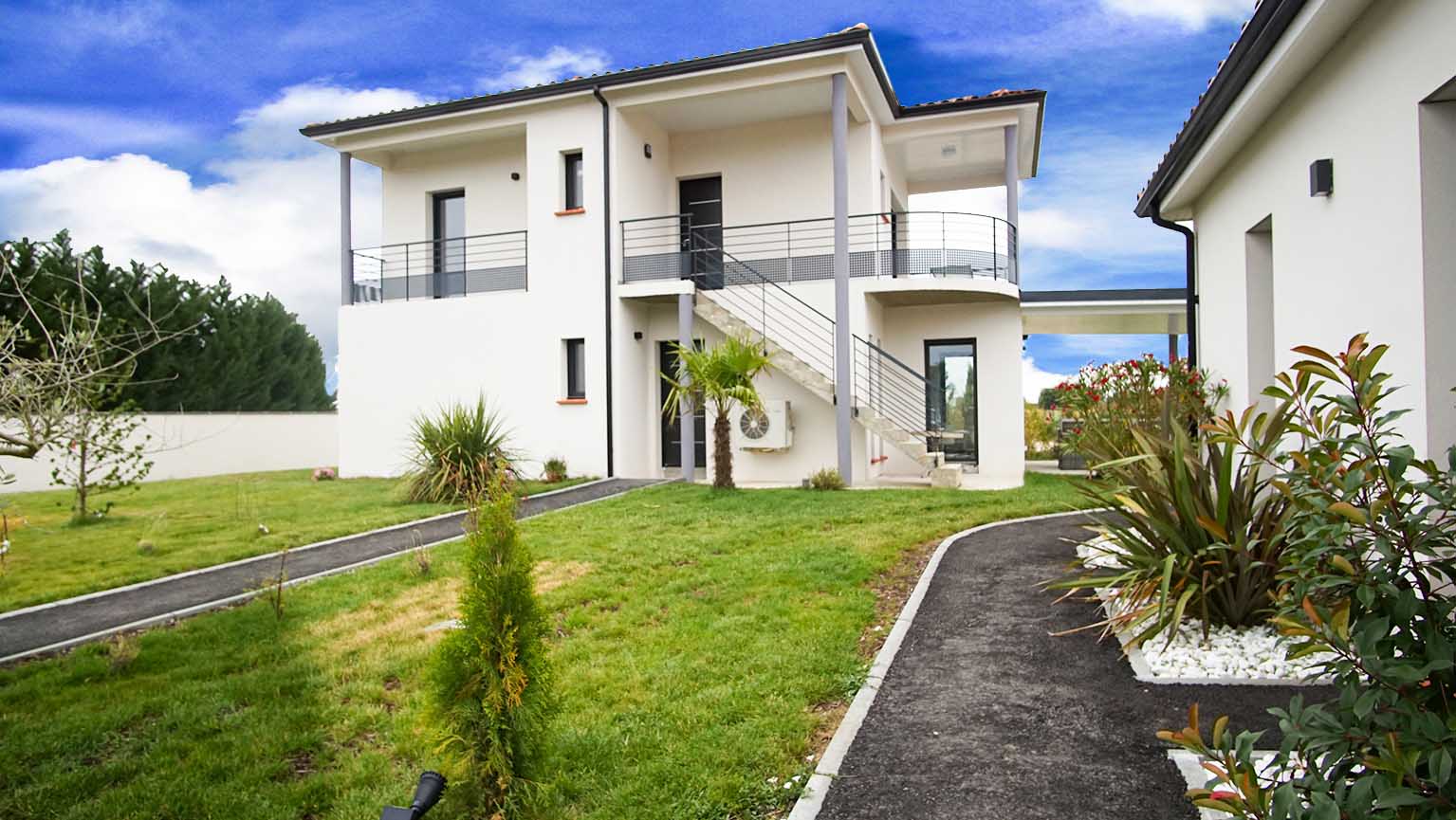 Cette maison réalisée sur la commune de Longages est pour le moins atypique ! La construction de l’ensemble de 90m2 sur deux niveaux a un style « hollywoodien ». Les poteaux bétons sur deux niveaux, étayent le balcon ainsi que l’avancée de toit. Sa géométrie complexe exprime une volonté forte de nos clients, qui souhaitaient que leur maison soit unique … à leur image tout simplement !